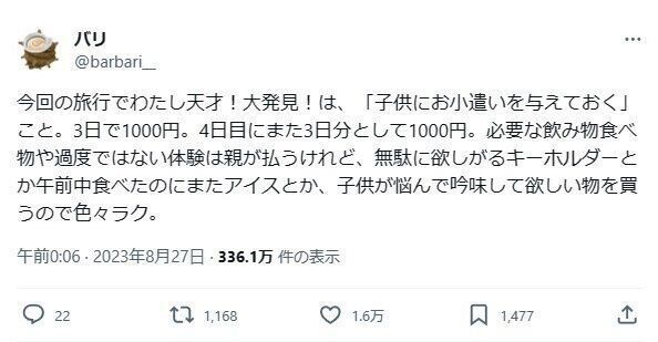 バリさん(@barbari__)が投稿したのは子どもとの旅行での大発見。子どもに「あれ欲しい」「あれ食べたい」とねだられがちですが、それを回避すべく取り入れた”子どもにお小づかいを与えておく”作戦が有効的でした。バリさんに詳しく話を伺います。