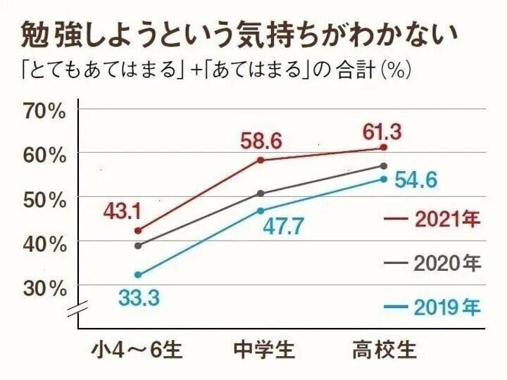 コロナ禍を経験した子どもたち。小学校中学年から高校生では、コロナ禍以前の調査と比べ、学習に対するやる気が沸かないという子が増えました。
