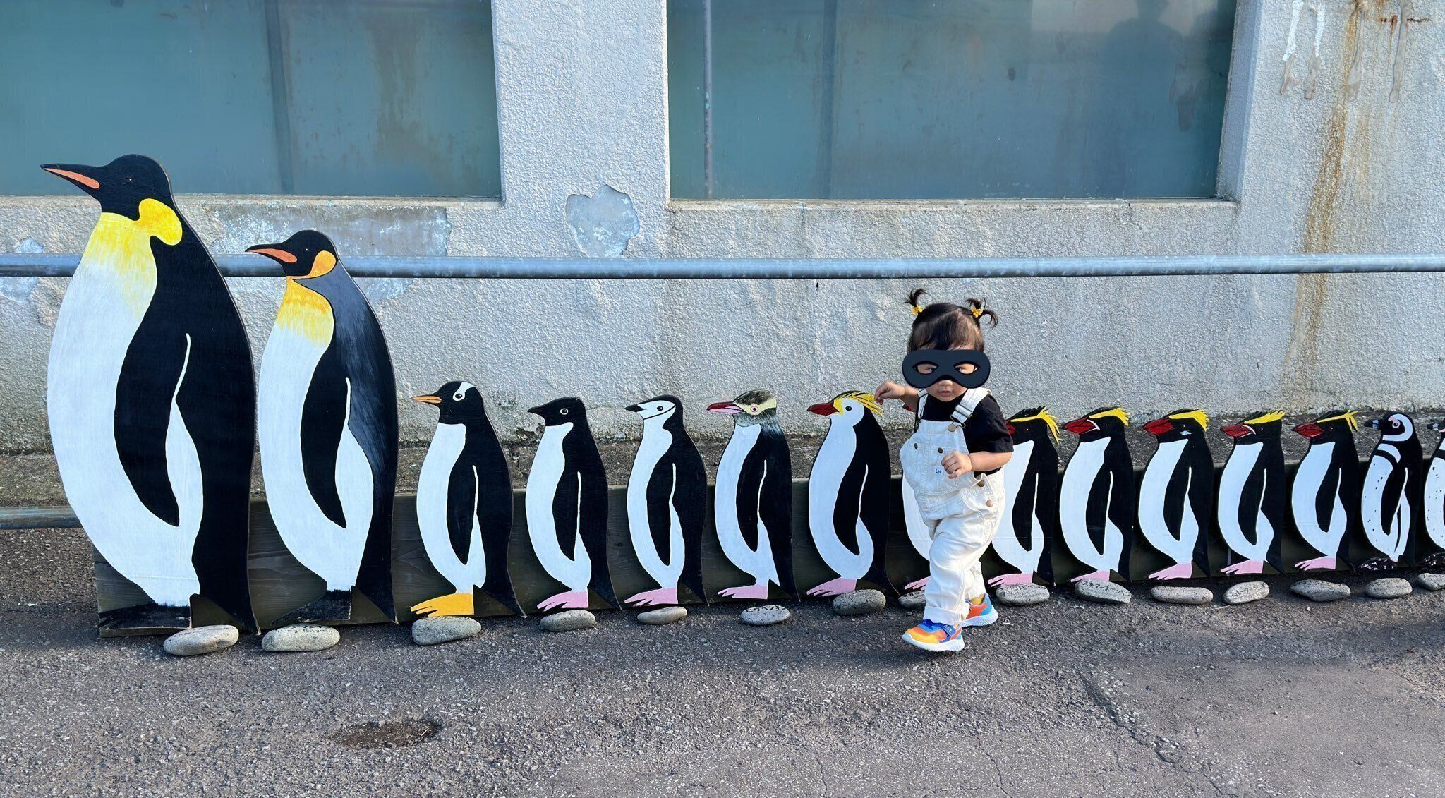 コウテイペンギンやフンボルトペンギンなどさまざまな種類のペンギンを模したパネルが1列に並んでいます。そのそばを歩くのは、くるる1yさんの娘さんです。