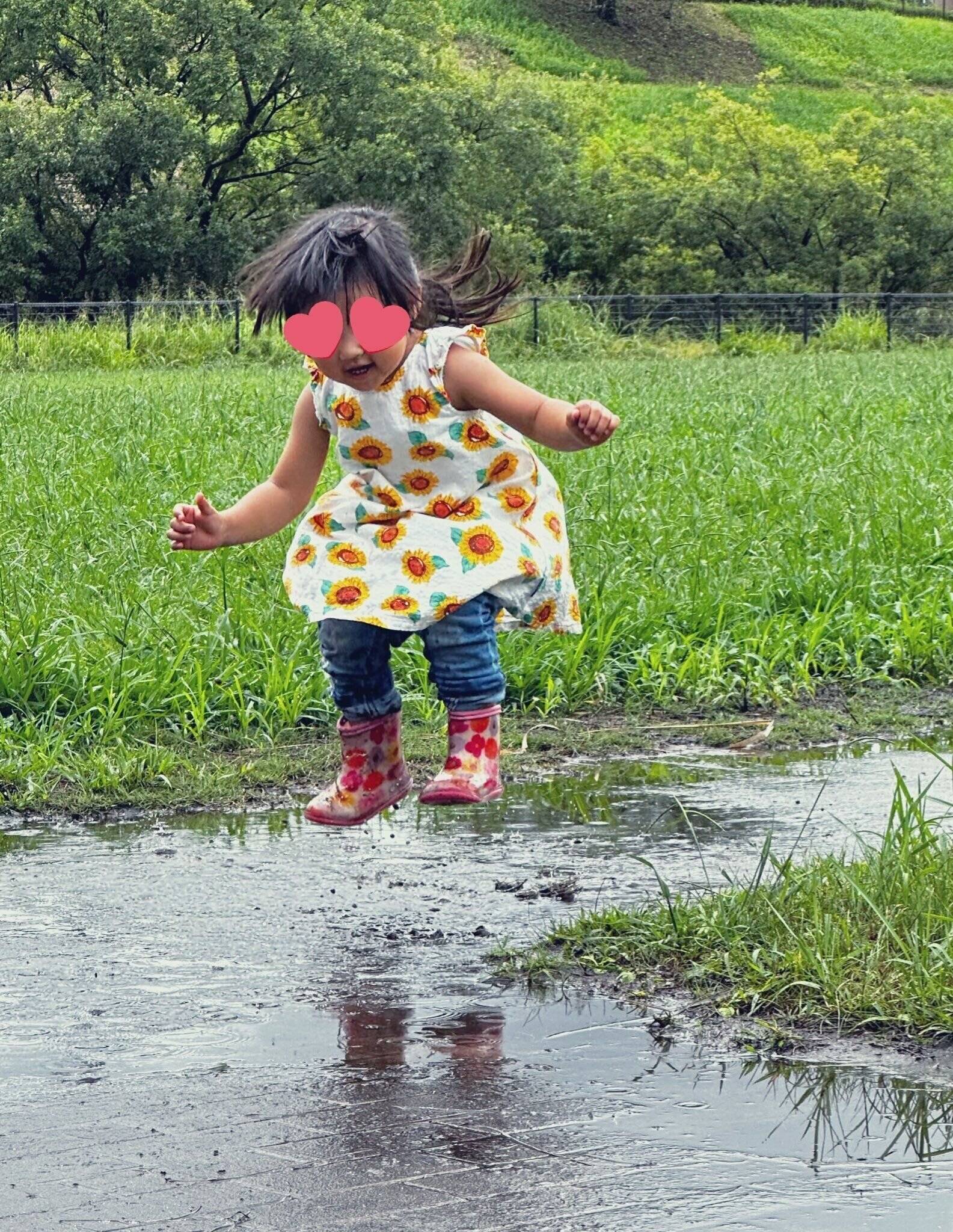 い大さんが、「これは水たまりに飛び入る瞬間の2歳11ヶ月」というコメントとともに投稿した写真がこちら。