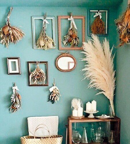 スワッグはドライフラワーで手作りした物。アンティークの額縁の中に飾ったら、絵画風になってお気に入り。