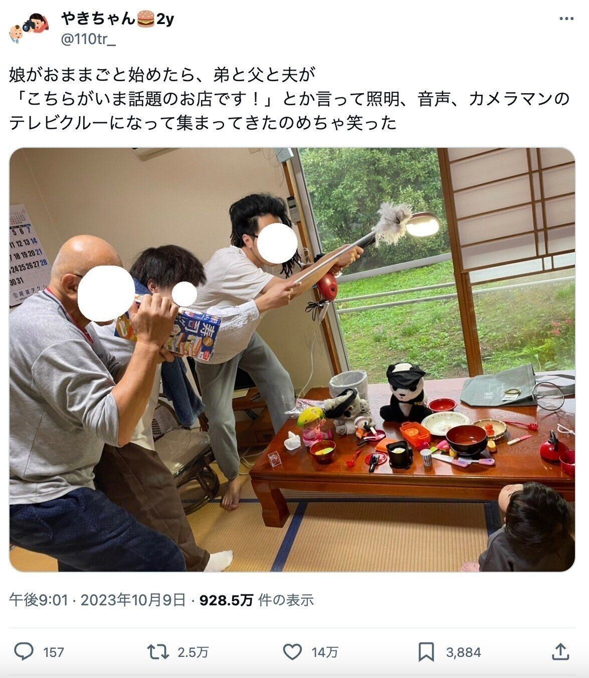 やきちゃん2yさん(@110tr_)が投稿した写真に14万件のいいねがつき、話題になっています。写真に写るのは、おままごとをする娘にテレビクルーさながら取材を始めた家族の姿!手にはライトやハタキ!?愉快な家族について、お話をうかがいました。