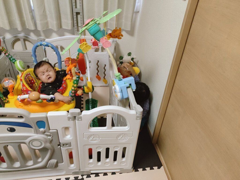 長男くんはサークルの横の隙間に隠れ、次男くんは泣き出してしまいました。