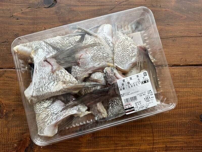 これまで、ブリカマは並んでいたことがありましたが、真鯛は初めて。筆者が購入したパックは855g入りでしたが、10枚のかまが入っていました。これはとってもお得!