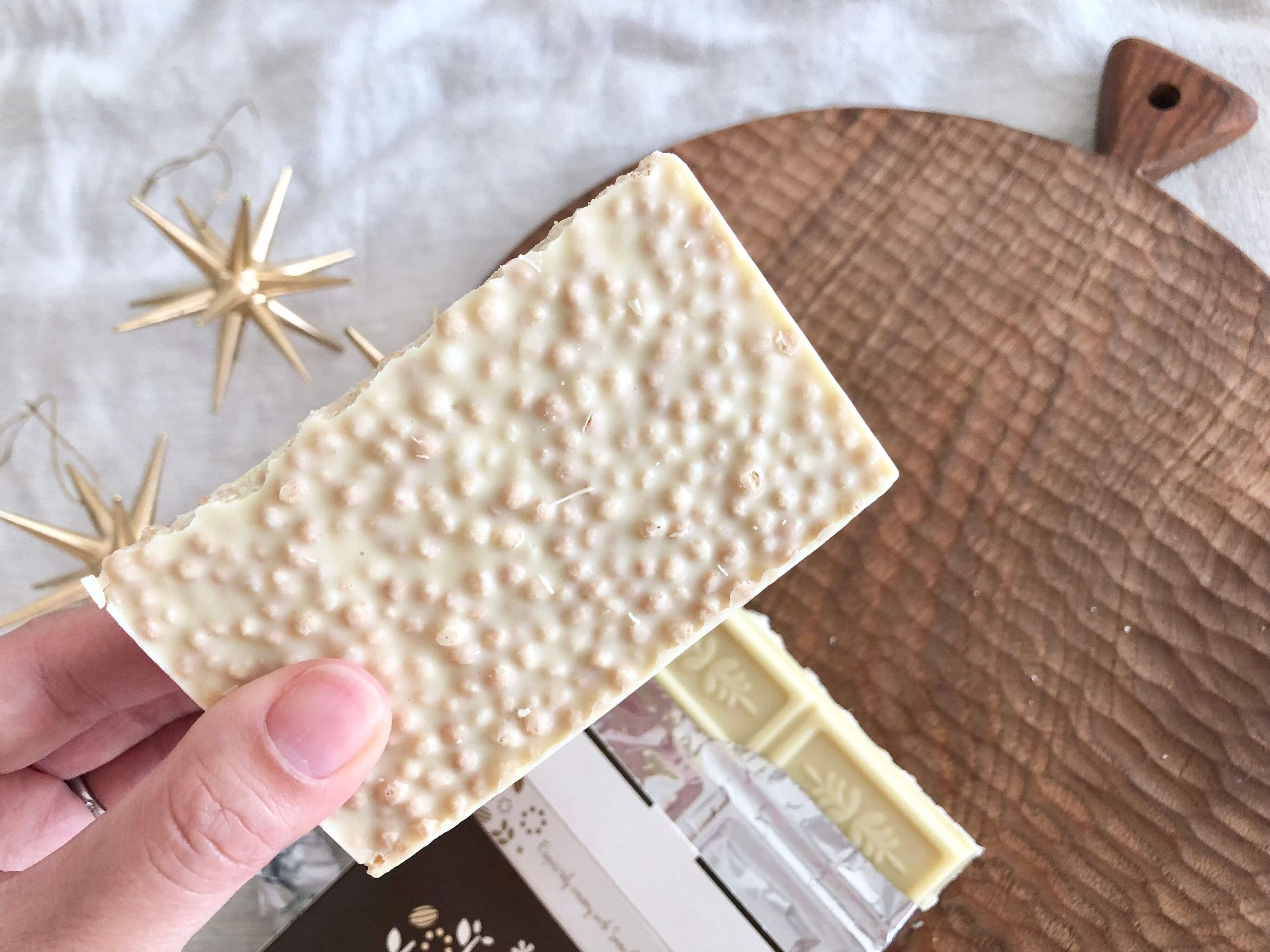 業務スーパーの「クランチホワイトチョコレート」は、上品な甘さでクリーミーなホワイトチョコレートとサックサクのパフの食感が絶品!