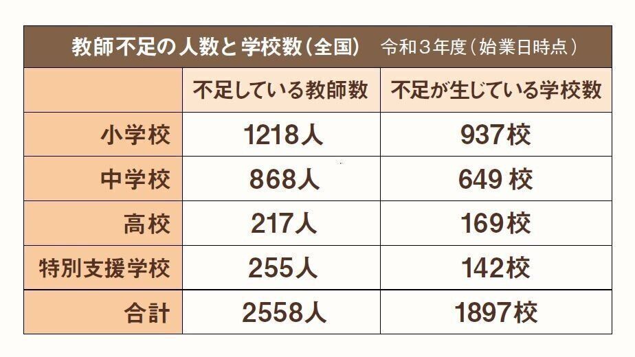 各自治体の教育委員会が、学校に配置することとしている教師の人数(配当数)に対して、不足している教師数は始業日時点で約2500人。