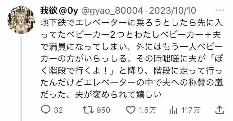 今回ご紹介するのは、我欲@0yさんが投稿した、満員エレベーターでの思いやりを感じる夫の行動。