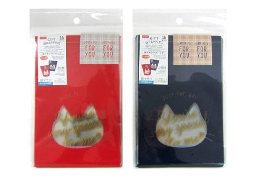 底マチクリアバッグ(ねこ、16枚、約18.5×12×5cm)(110円)は、ねこモチーフのデザインがかわいいOPP袋です。ネイビーとレッドの2色展開で発売中。ギフトなどのラッピングに使えば喜ばれること間違いなしです。