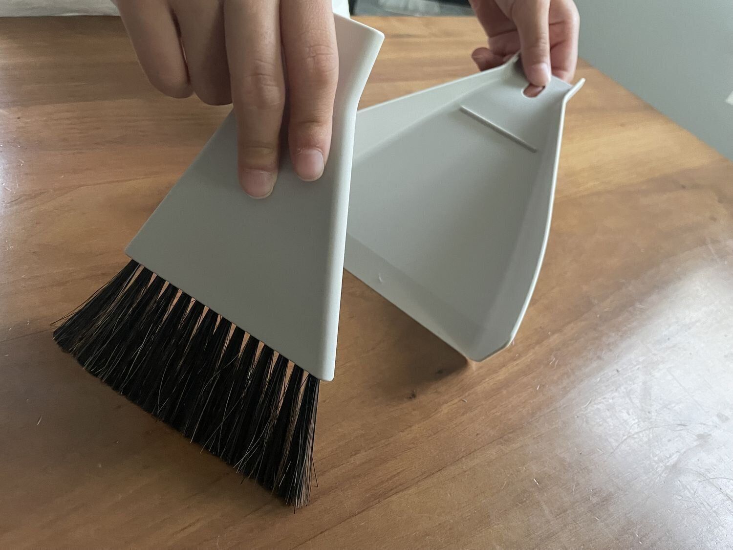 厚みがわずか4cmとコンパクトなつくりにも関わらず、ほうきとちりとりがセットになっています。ほうきは持ちやすい三角形になっており、ちりとりもごみを入れやすい形状。