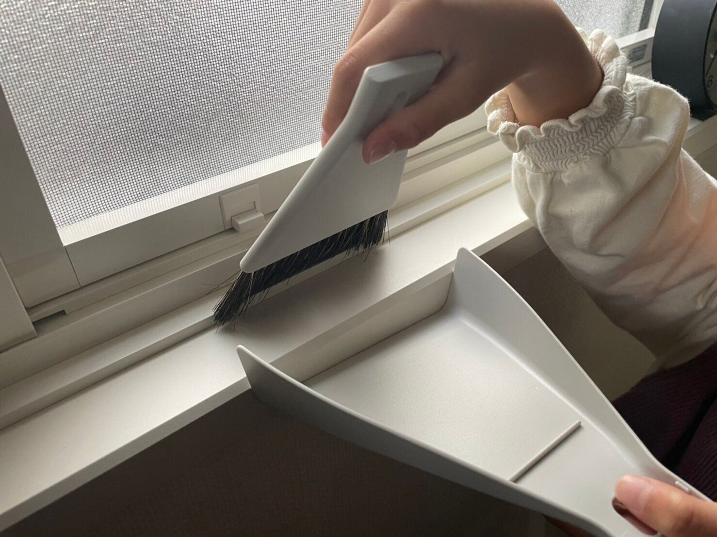また、窓枠の掃除にも便利で、こまかい埃やごみを綺麗に掃除できます。ほうきの毛の形状が台形型になっているので、窓枠の隅までお掃除がしやすいですよ。