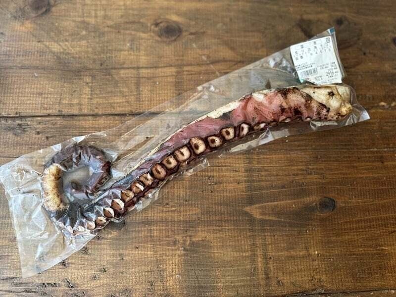 それがこちら「あぶり北海たこ」です。大振りなたこの足が一本まるごとあぶられていて、真空パックになり販売されていました。