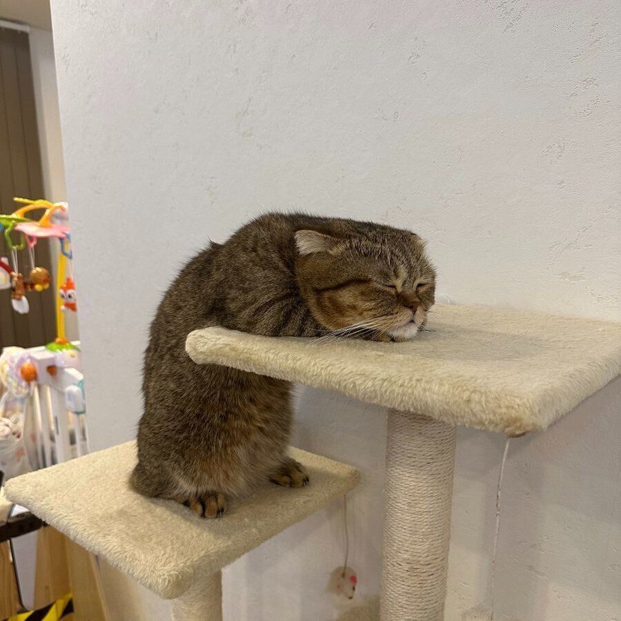 たぬ吉とあきぼうとさやぼうさん(@ponpokopontanu)が投稿したのは、飼い猫のたぬ吉くんがキャットタワーを登る様子の写真です。たぬ吉くんは疲れてしまったのか、登っている途中でぐったり。この様子が可愛すぎると話題となっています。