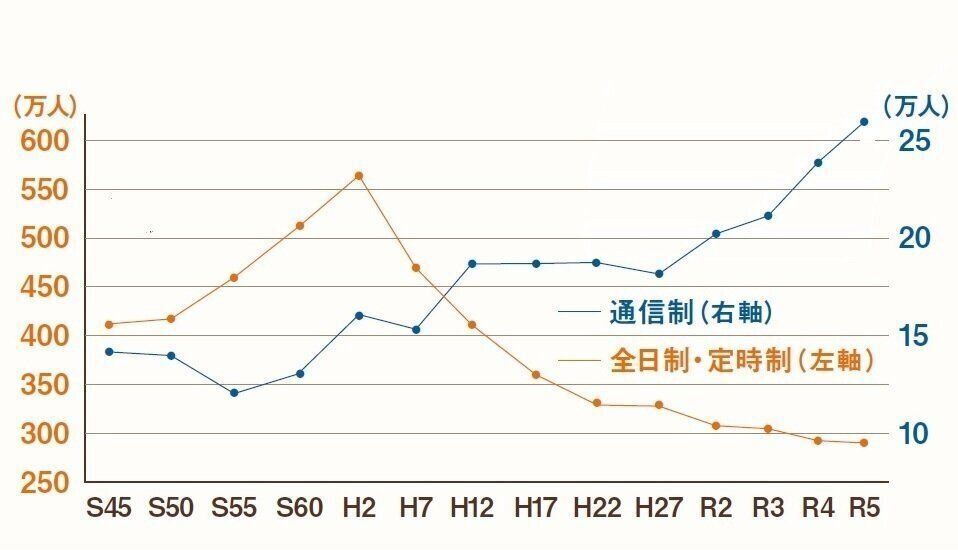 少子化の影響で、全日制・定時制高校への進学者数は減少し続けているが、通信制高校への進学者は増えている。特にコロナ禍以降は急激な上昇傾向が見られる。