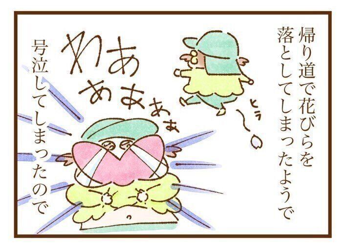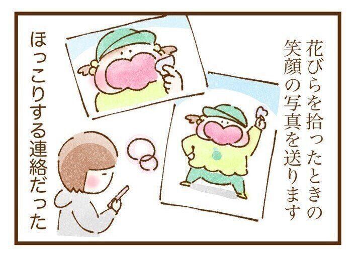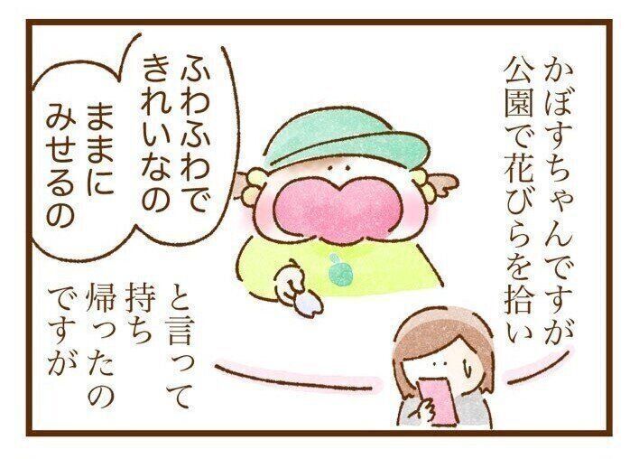 メッセージによれば、公園で花びらを拾い「ふわふわできれいなの、ママにみせるの」と言って持ち帰ったかぼすちゃん。