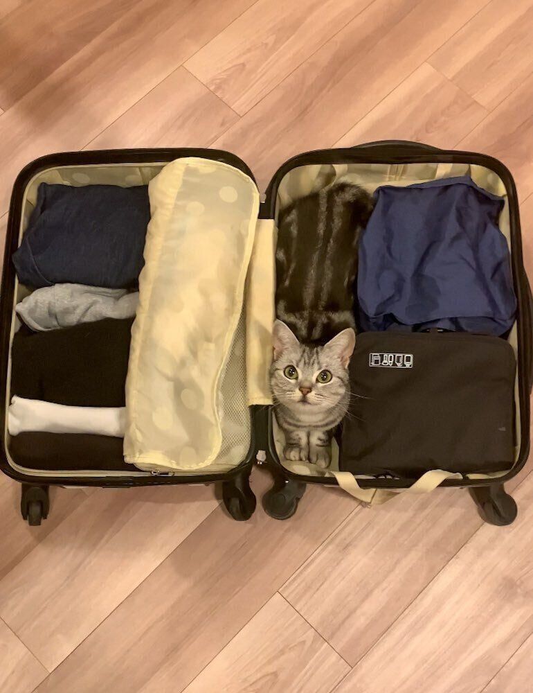 「出張に向けて順番に荷物を詰めていたのですが、ちょうどあんこがすっぽり入るスペースが空いてしまいピッタリ収まってしまいました……」