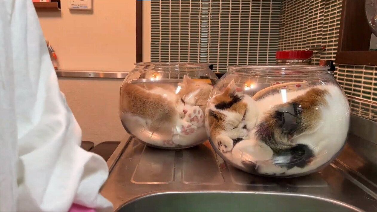 次々と金魚鉢の中へ吸い込まれていった猫ちゃんたち。まさか金魚鉢が猫ちゃんのベッドにこれほど適していたとは驚きでした。とても気持ちよさそうな姿は多くの人に癒やしを与えてくれました。