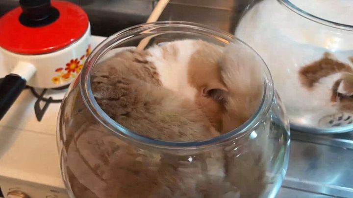キッチンに猫ちゃんの入った金魚鉢が並ぶ様子は、とても不思議でありながら癒やされる光景でもありました。