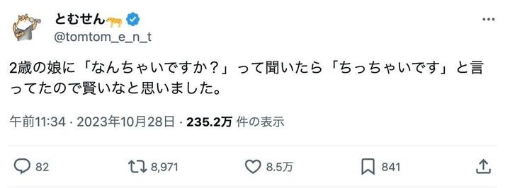 とむせんさん(@tomtom_e_n_t )が、2歳の娘さんとのほほえましい会話をXに投稿したところ、8.5万件ものいいねがつき話題になりました。パパに「なんちゃいですか?」と聞かれた時の、娘さんの賢い返答に注目です。