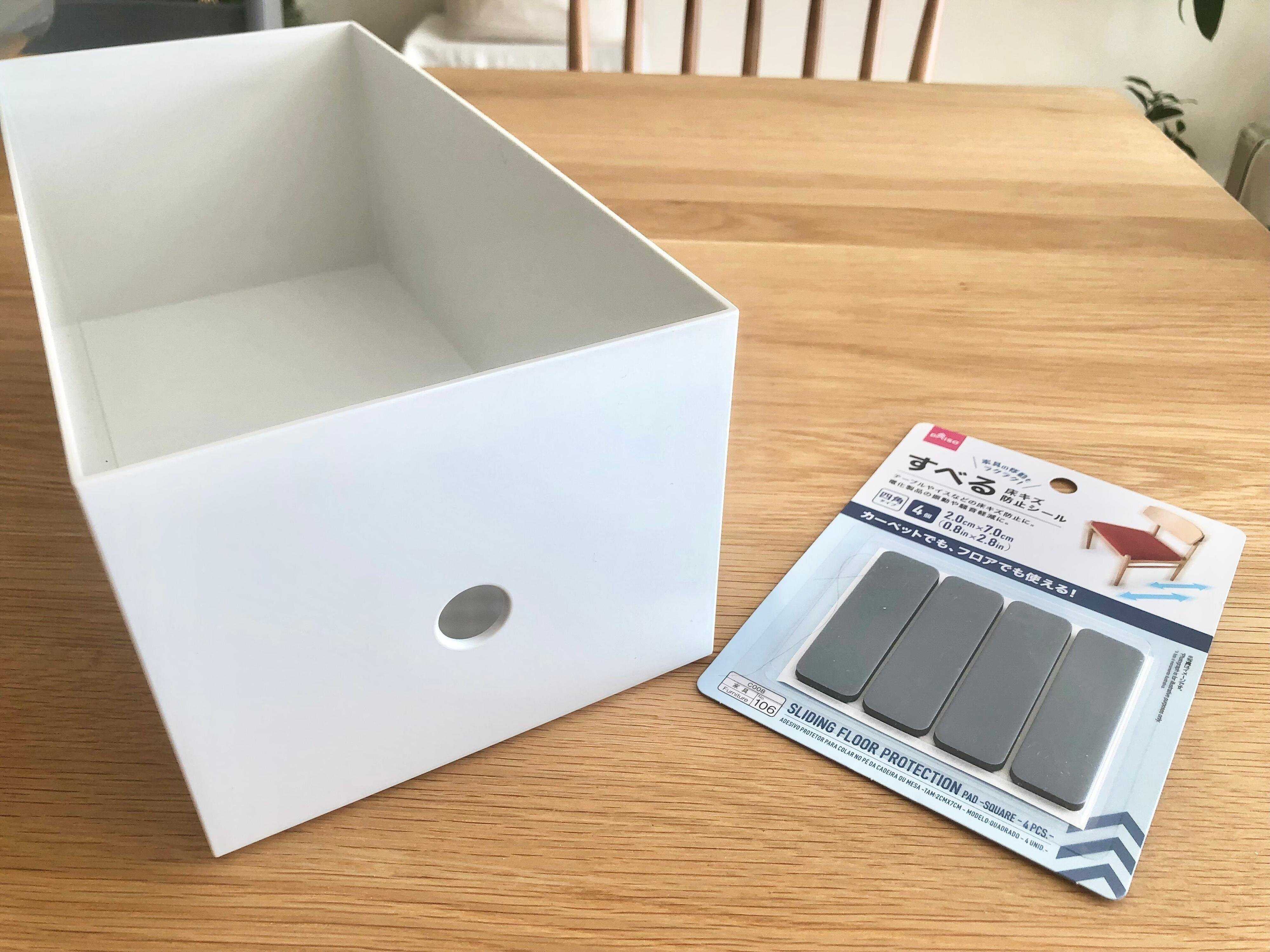 ですが、今回は椅子の脚ではなく、無印良品や100均などでよく見かけるPP製(ポリプロピレン製)のファイルボックスに使用します。