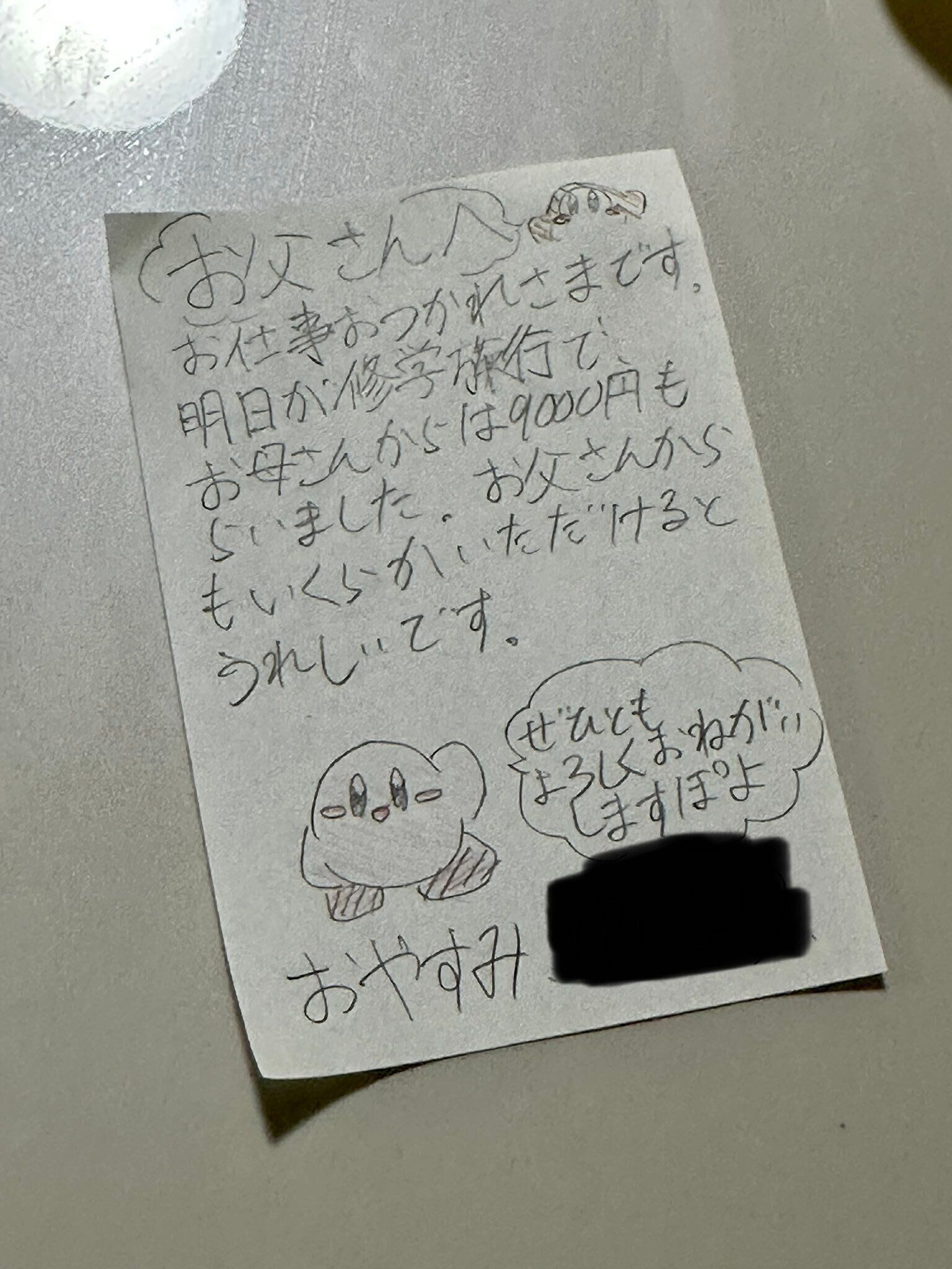 手紙には、「お父さんへ お仕事おつかれさまです。明日が修学旅行でお母さんからは9,000円もらいました。お父さんからもいくらかいただけるとうれしいです」と書かれています。