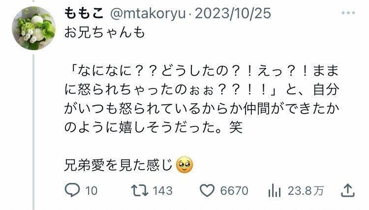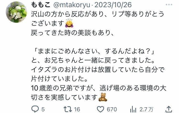 親がついカッとなってしまったとき、逃げ場があることはきっと子どもにとっても大きな支えとなりますね。兄弟の絆がより一層深くなったのではないでしょうか。これからの成長も楽しみです。