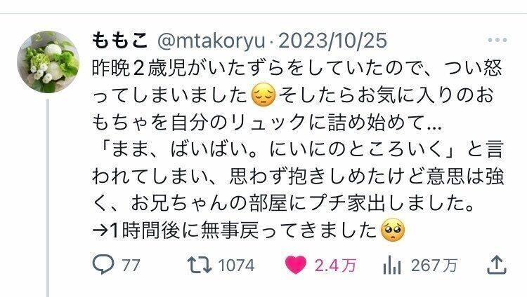 今回ご紹介するのは、ももこさんがXに投稿した2歳の三男のプチ家出について。