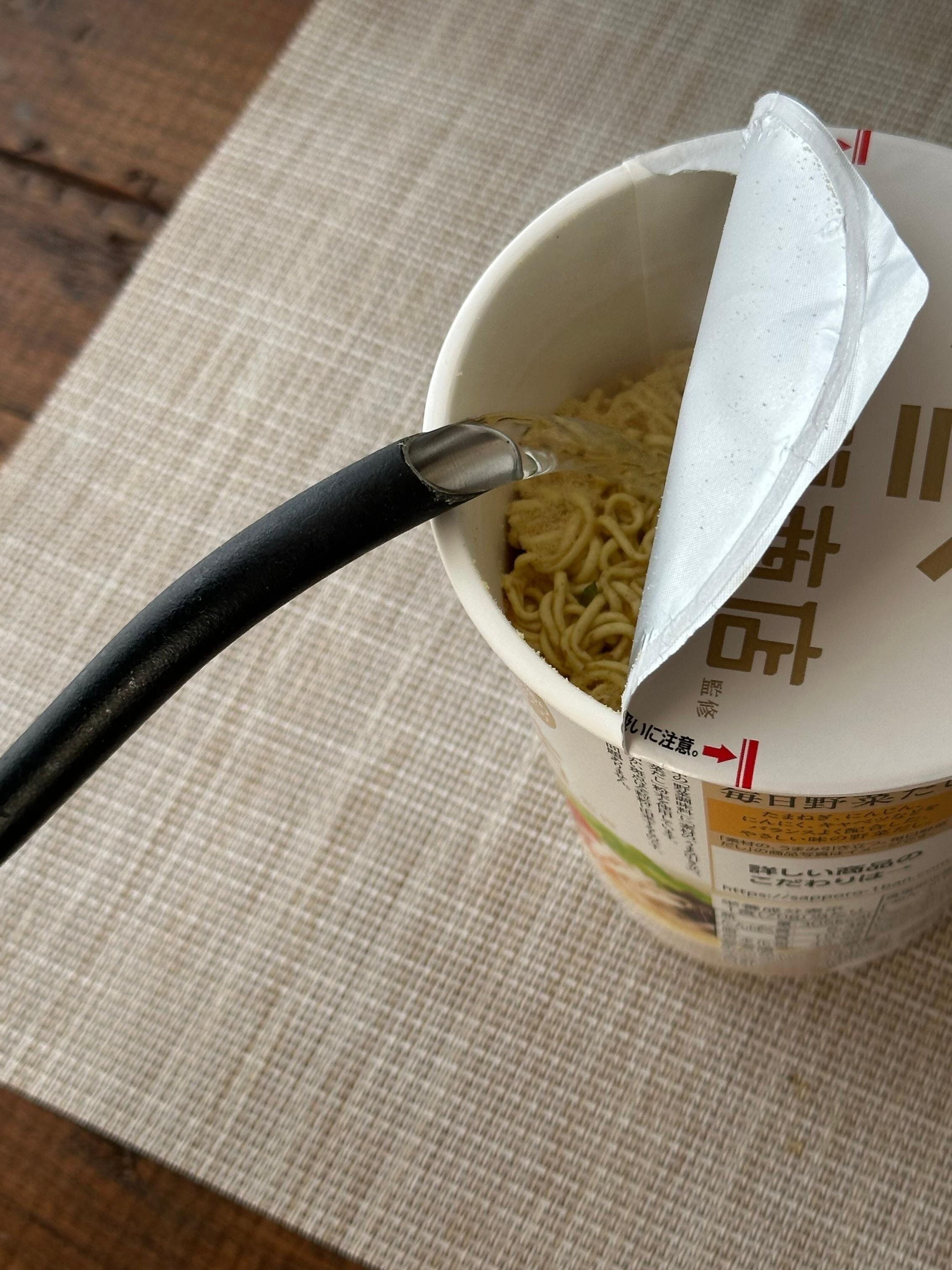 カップ内側の線までお湯を注いで、蓋をしめて3分待つだけで完成です。