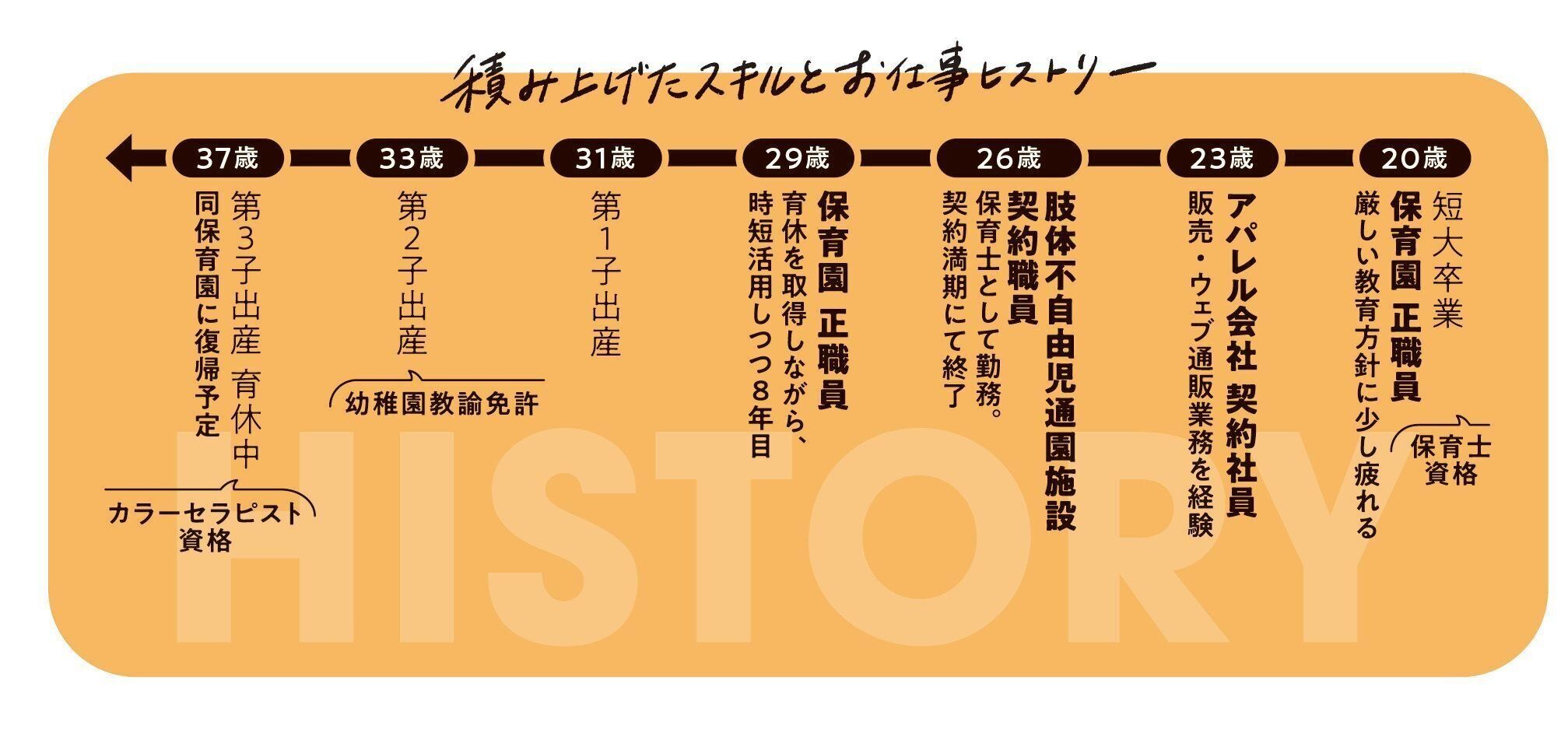 夫、長女6歳、長男4歳、二男0歳の5人家族。結婚7年目。高校生の時の障害児施設ボランティアを経験したことから保育士を志す。育休などを挟みながら現在の保育園は8年目。
