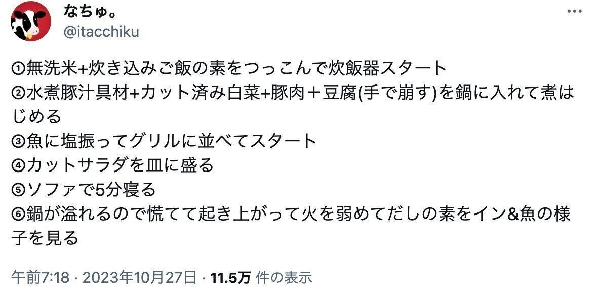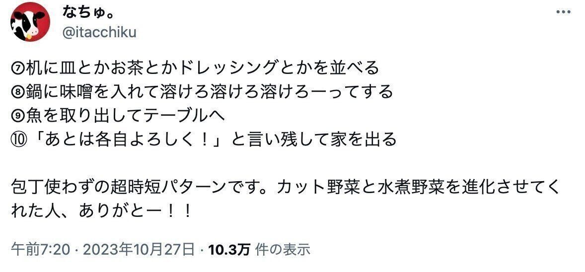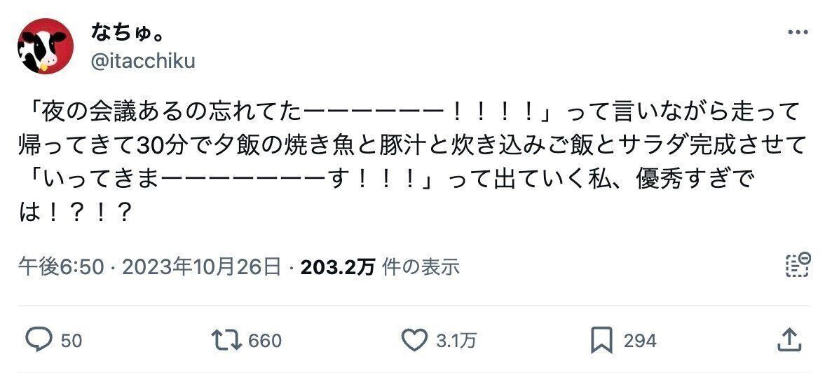 帰宅中に会議の予定を思い出した、なちゅ。さん(@itacchiku)。仕事に戻るため、帰宅後30分で家族の夕飯を4品支度したという投稿をしたところ、3.1万件のいいねや「神の領域」と称賛の声が集まりました。なちゅ。さんにお話をうかがいます。