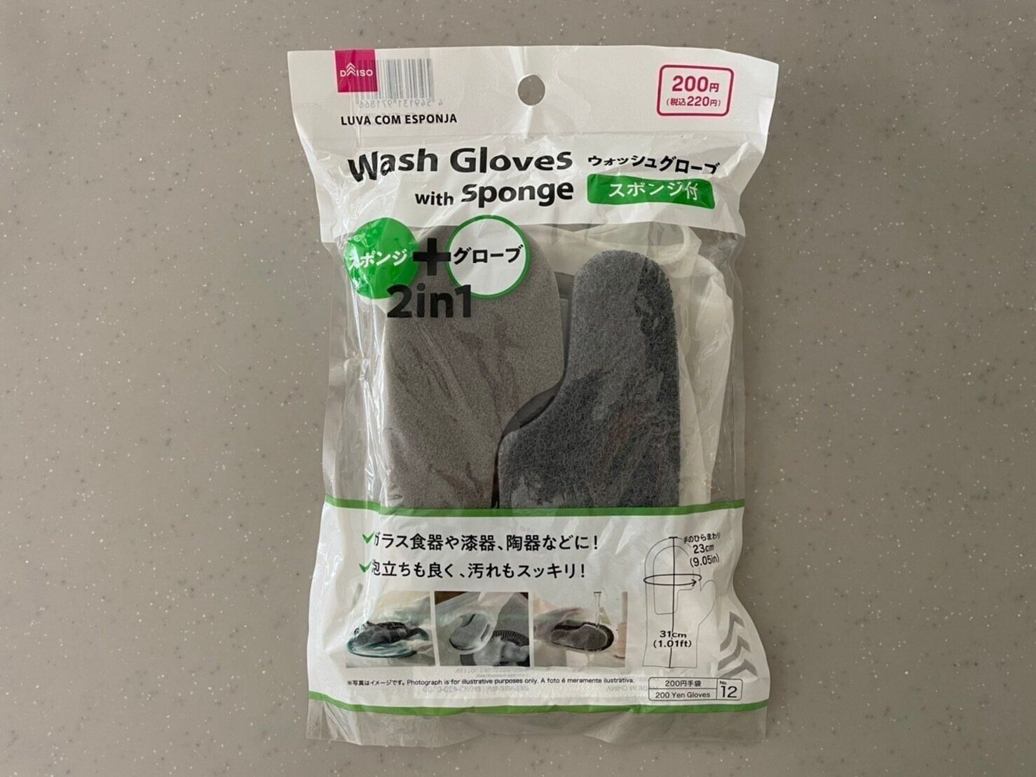 グローブとスポンジがセットになっていて、価格は1双で220円。カラフルなゴム手袋はよくみかけますが、こちらはシンプルなモノトーン色なので、全体の色合いも半透明なゴム手袋の質感もとても好みでした。