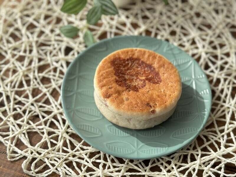 直径9cm、厚みは3cm、1個あたり平均で74gほどのパンで、表面にはチーズが焦げたような跡がついているのも特徴です。型に入れて焼き上げたような、大判焼きのような特徴的な形で、パン生地自体はとても薄く歯切れのよい食感です。