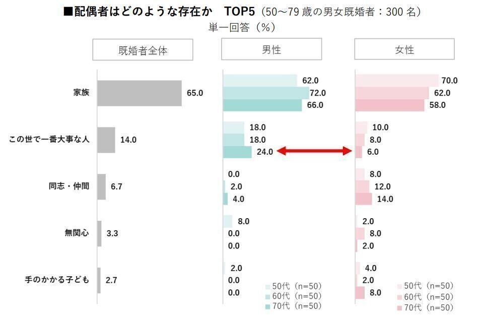 「配偶者はどのような存在か?」という質問に「この世で一番大切な人」と答えた70代の内訳を見ると、男性24%に対して女性は6.0%。