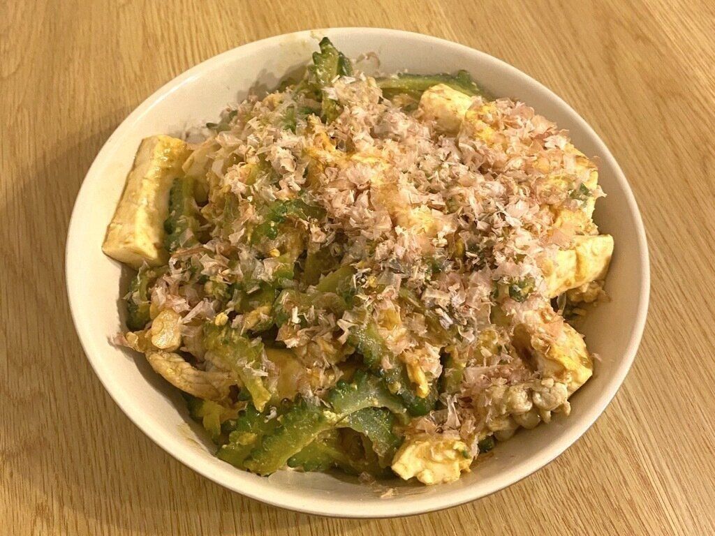 たれは醤油ベースでほんのり甘みがあり、かつお節の旨みがきいています。具材を炒めて味付けしただけとは思えないほど、具材にしっかりと味が染みていて驚き。ゴーヤだけでなく豆腐にもしっかり味がついていて、たんぱくな味の豆腐がご飯の進むおかずになっています。
