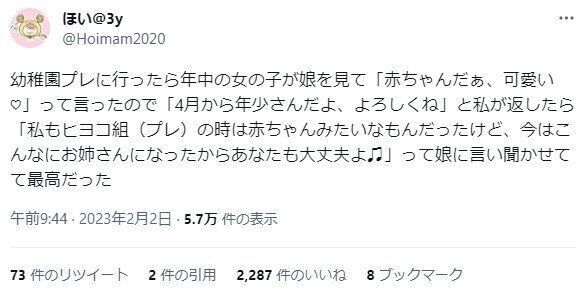 今回ご紹介するのはTwitterに育児や日々の出来事を投稿しているほい@3yさん(@Hoimam2020)のツイート。娘さんが幼稚園のプレ保育に参加したところ、年中の女の子が素敵なアドバイスをしてくれたのだそう。お話をうかがいました。