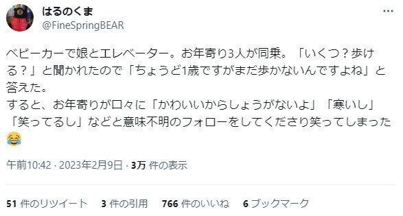 はるのくまさん(@FineSpringBEAR)がTwitterに投稿したのは、1歳の娘さんとエレベーターに乗ったときのできごと。同乗していたお年寄りたちが、ベビーカーに乗っていた娘さんを見て話しかけてきました。笑ってしまうその内容とは。