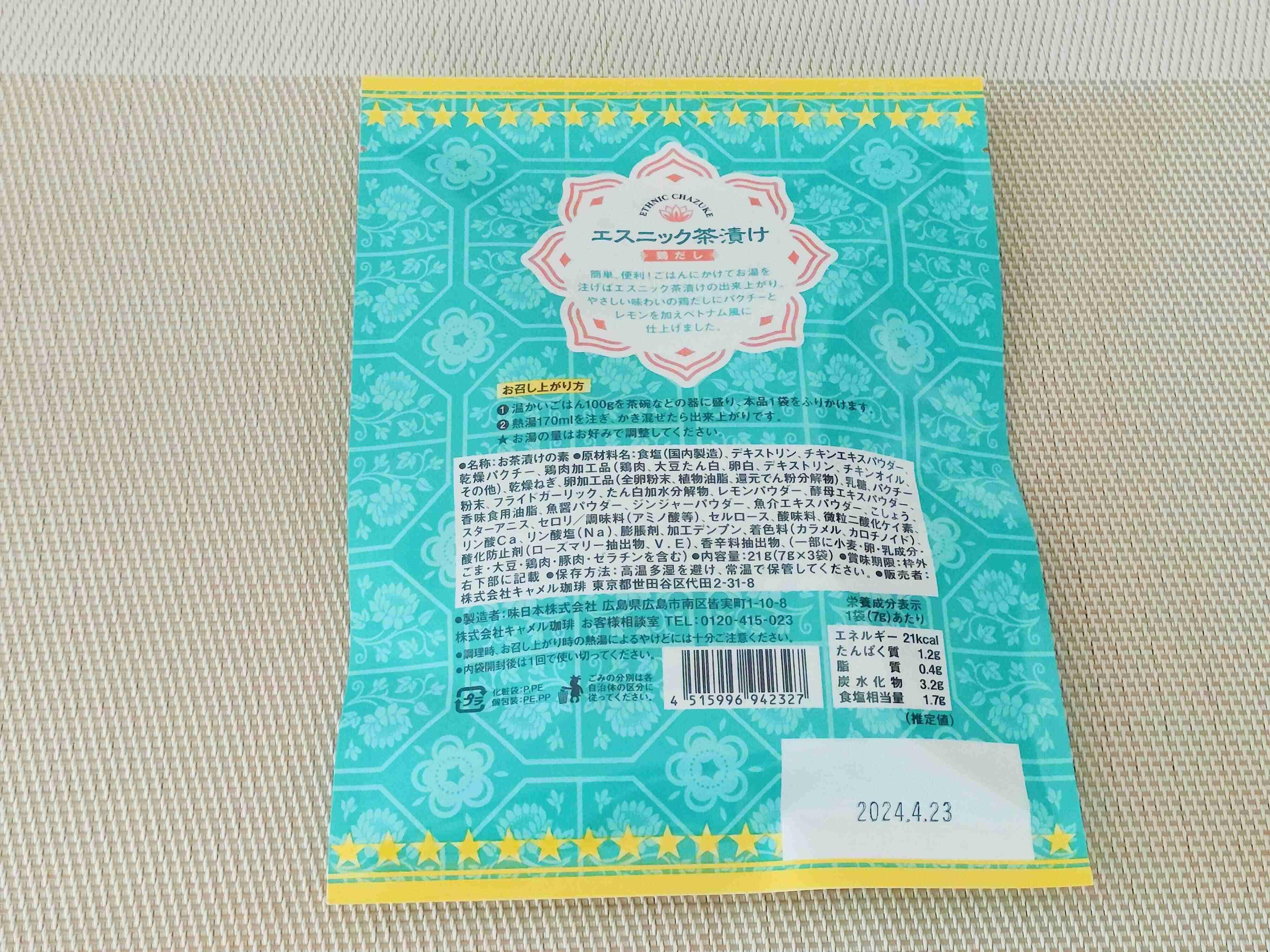 明るいエメラルドグリーン色にアジアンな模様が描かれたパッケージが目を引く「エスニック茶漬け」。お茶漬けといえば、出汁もしくはお茶をかけて食べる料理で、どちらかとうと和風のイメージです。