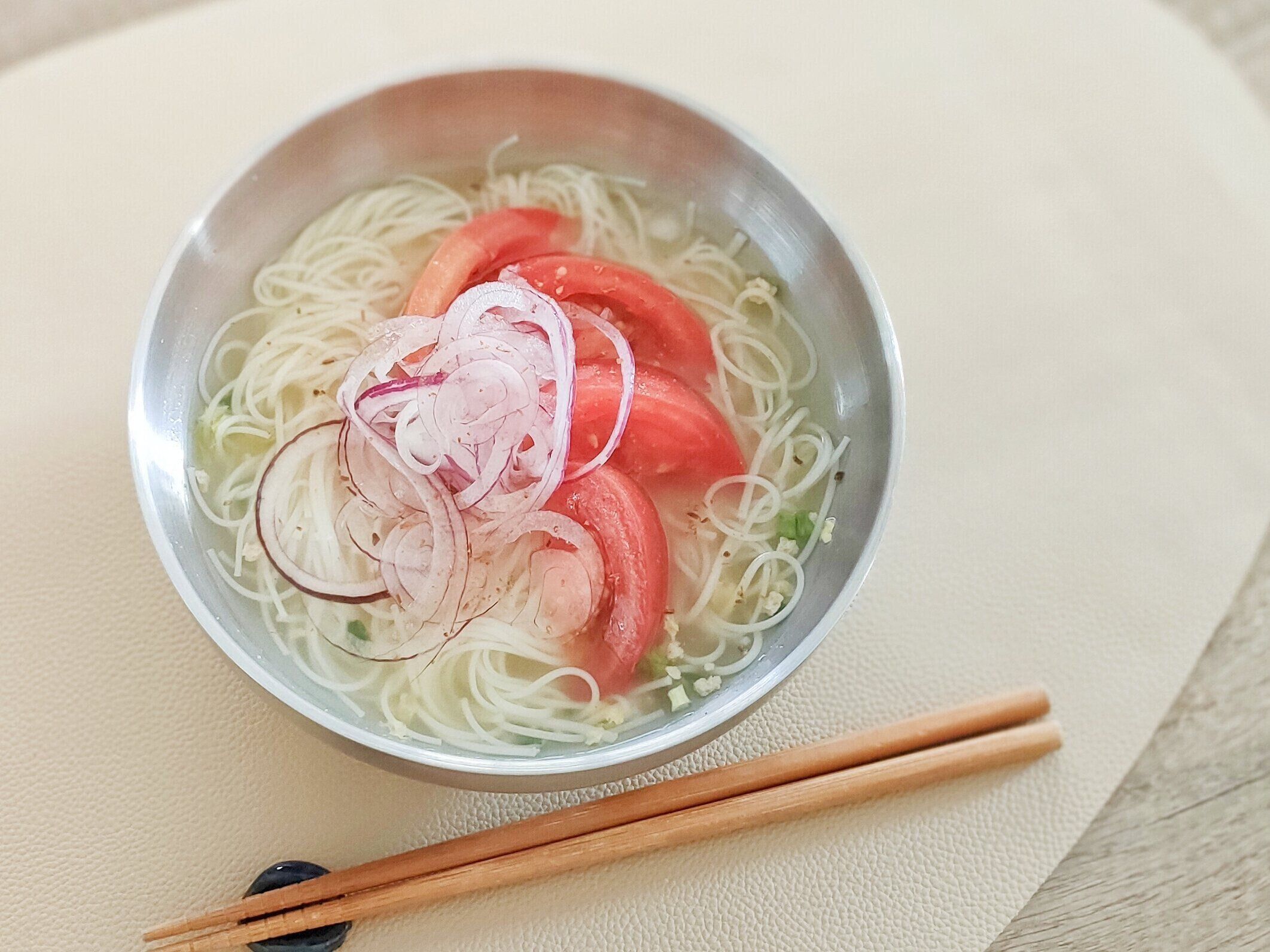 アジアンな風味にそうめんはバッチリ!お茶漬けと同じように、トマトや紫玉ねぎを合わせてボリューミィにするとランチにぴったり!ちょうど気温の高い時間に食べてほしい一品です。