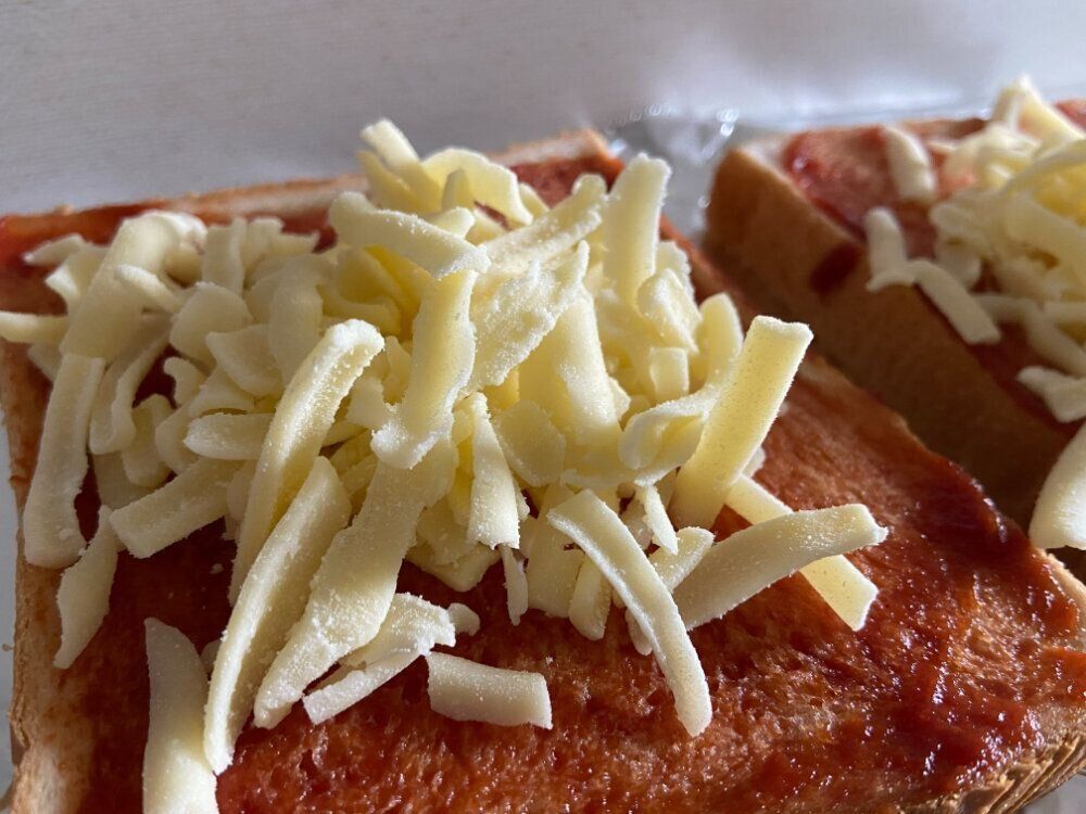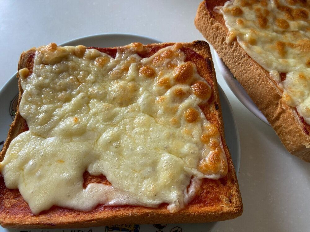 子どもたちの朝食によくつくるのはピザトースト。具がなくても、食パンにケチャップを塗ってチーズをのせて焼けば簡単においしいチーズピザトーストの完成です。