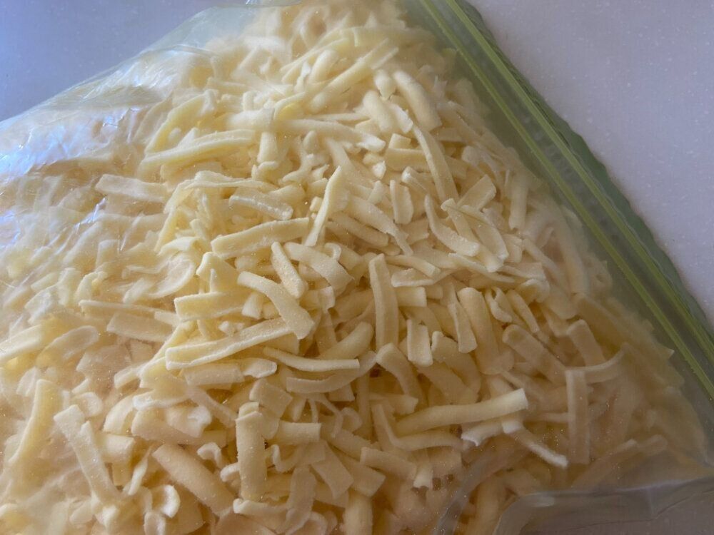 チーズ同士がくっつかないようにするコツは、2~3時間冷凍したら一度取り出し、袋の上からもみほぐします。パラパラっとほぐれたらまた冷凍保存。これでいつでも使いたいぶんだけ、パラリと使いやすい状態に。