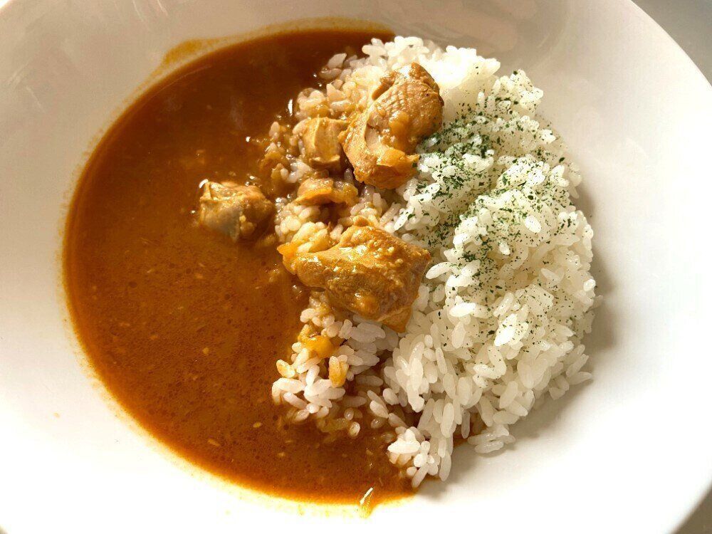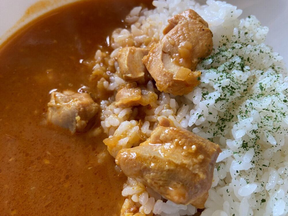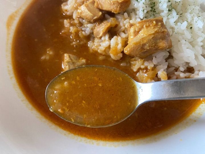 玉ねぎとトマトたっぷりで煮込まれたカレーには、チキンもごろごろっと入っていて食べ応えもあります。チキンはしっとり柔らかく旨みもあっておいしいですね。