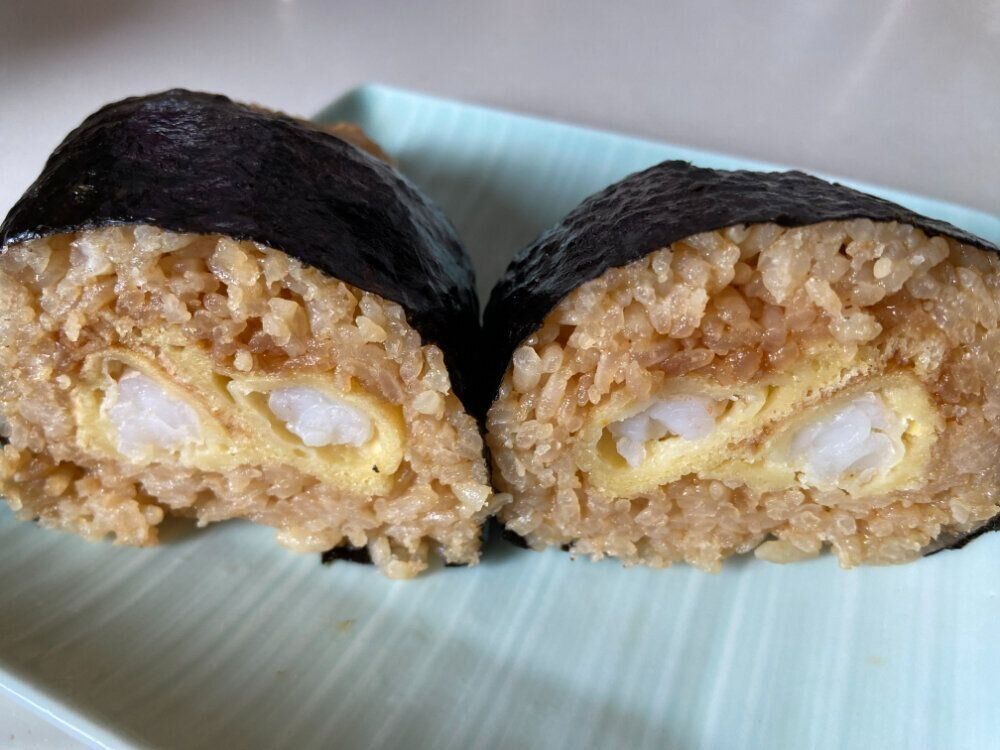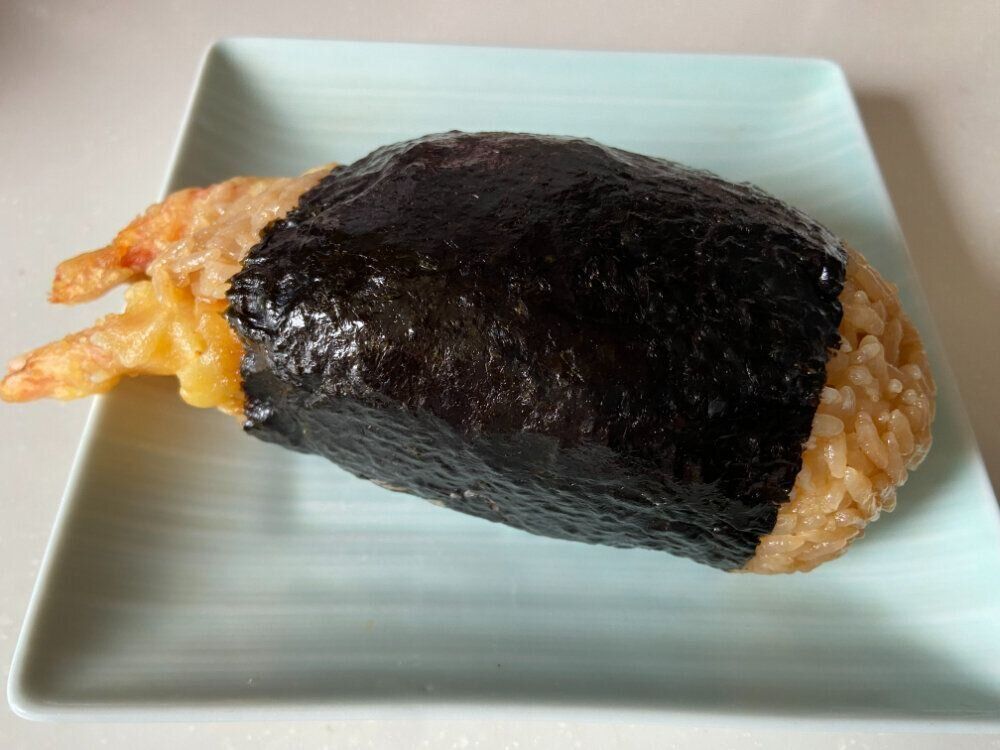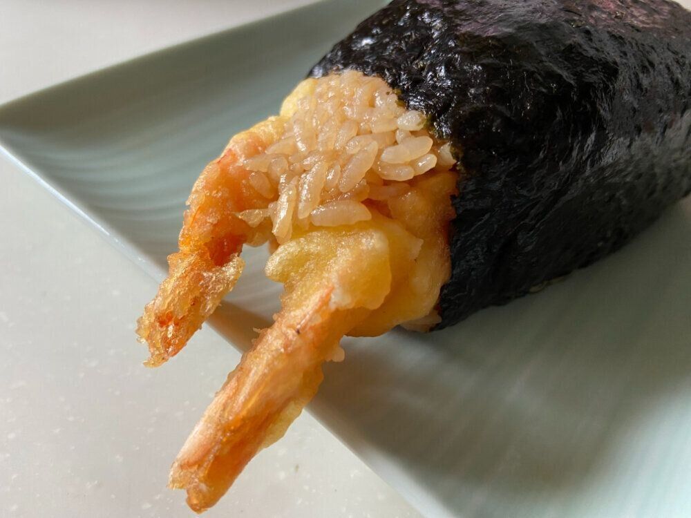 海老の天ぷらが丸々2尾入っています。なかなかほかでは見かけないオリジナリティあふれるおにぎりですね。