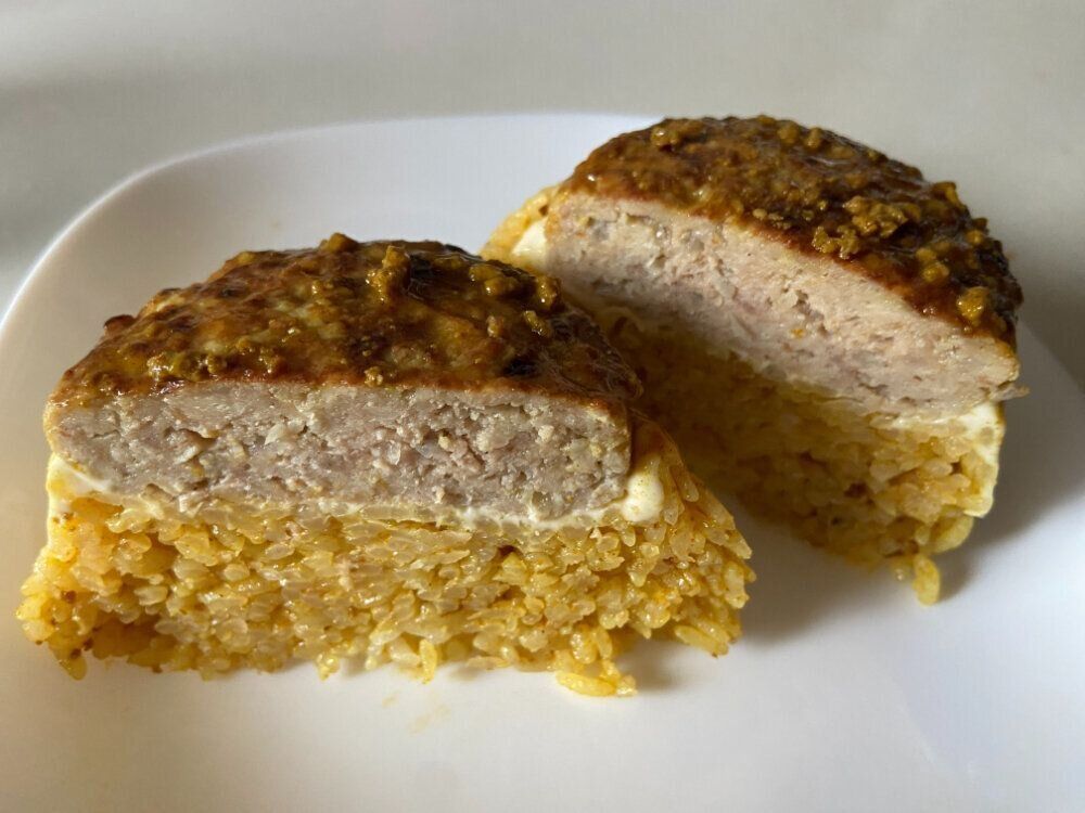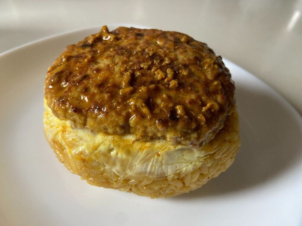カレーピラフにチーズ、大きなハンバーグがのっています。ハンバーグの上にはキーマカレーのようなソースがかかっています。