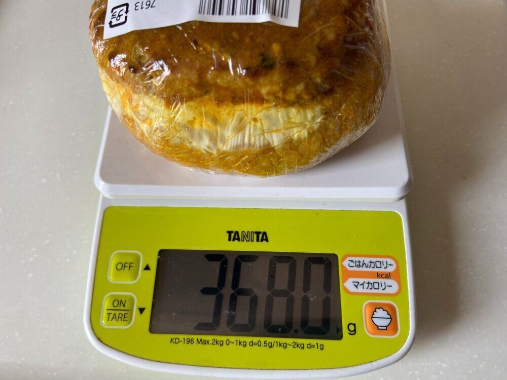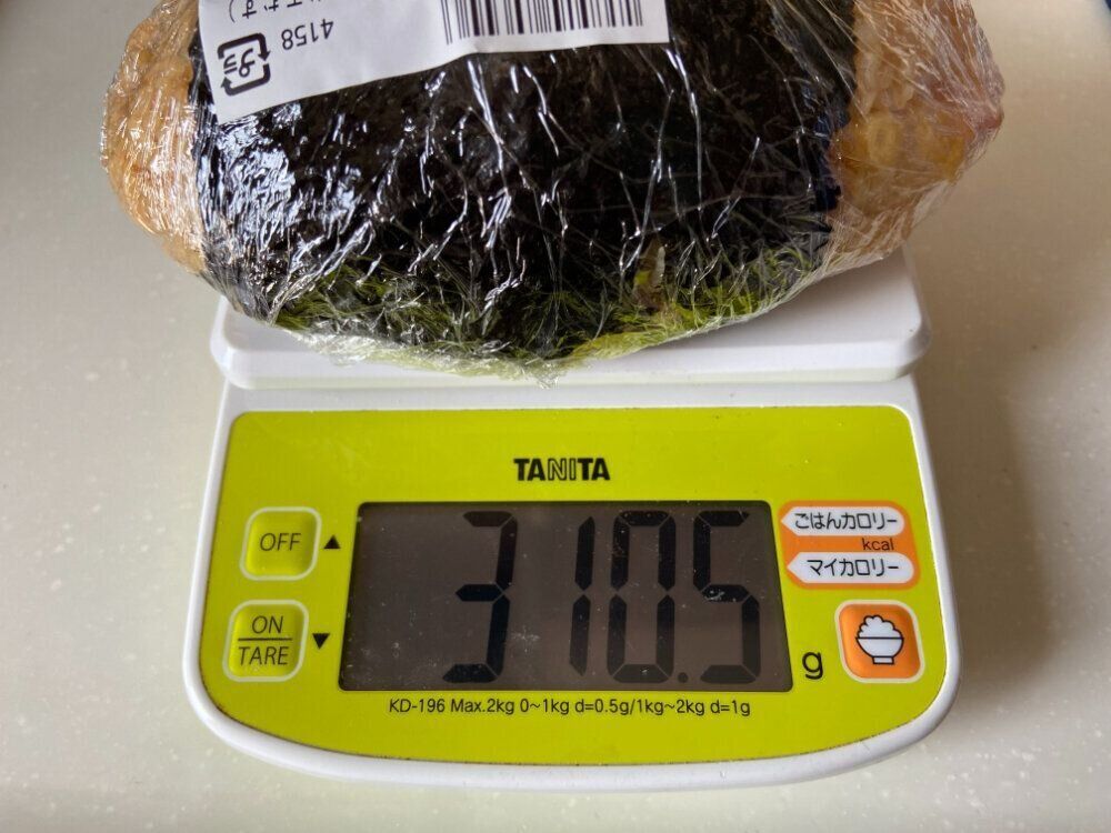 手でもってみると、おにぎりとは思えないほどの重量感。測ってみると、368gもありました。