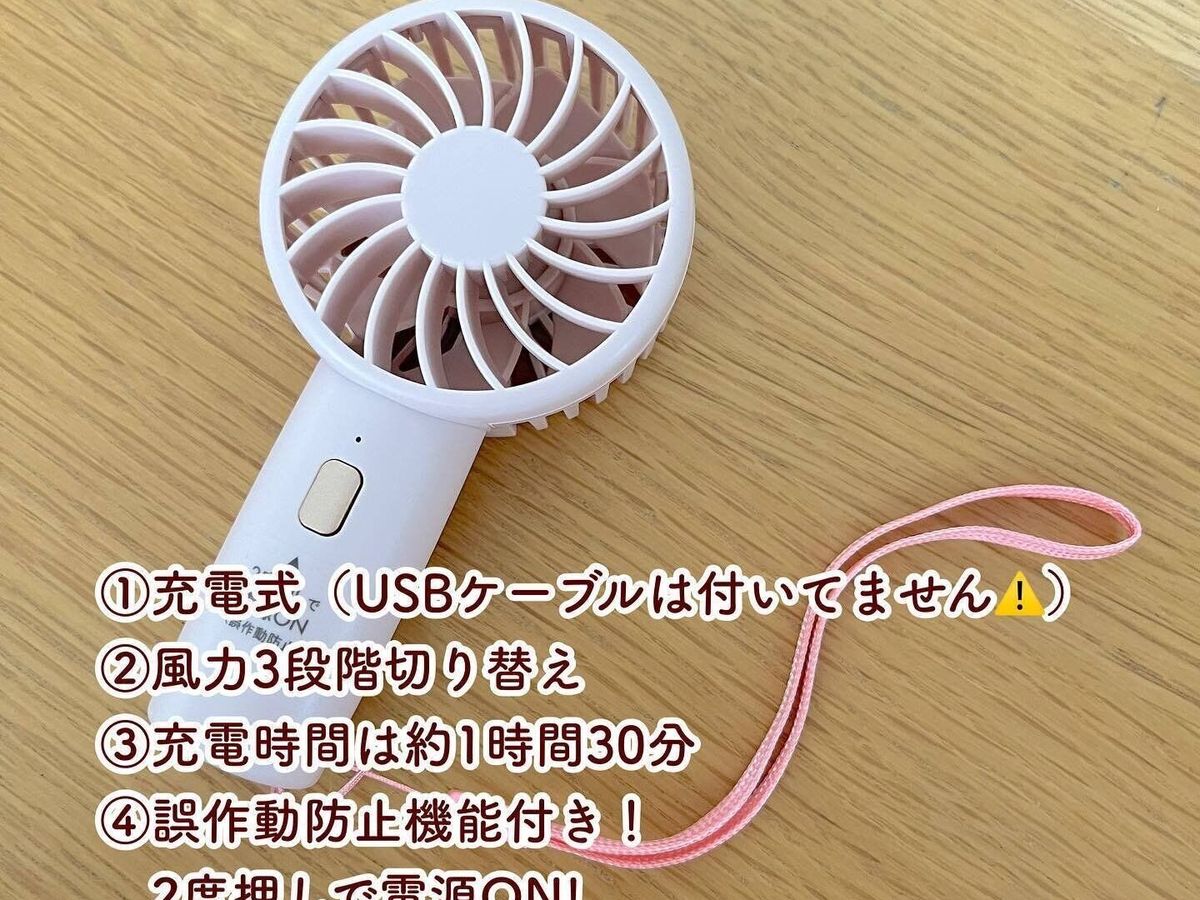 こちらは、暑い季節に大活躍する「ミニ扇風機(充電式、ハイパワー)」550円。手のひらサイズでコンパクトだから、持ち歩くのにも便利。三段階の調整機能付きで、暑さや用途によって風力を変えられます。くすみカラーも今時っぽくてかわいい!