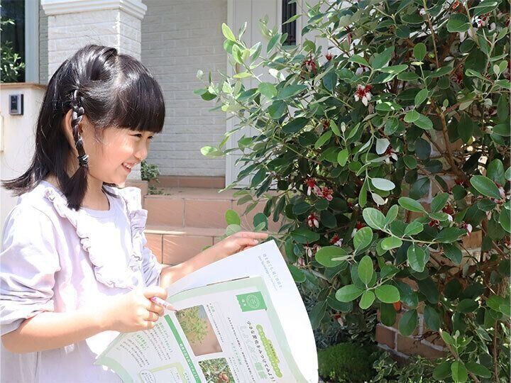 というわけで、まずは、「しょくぶつ観察」からスタート! ワークブックのアドバイスに沿って、「葉っぱの手触りは?」「匂いは?」「実の色は?」など、ママ・パパから観察のポイントを伝えます。