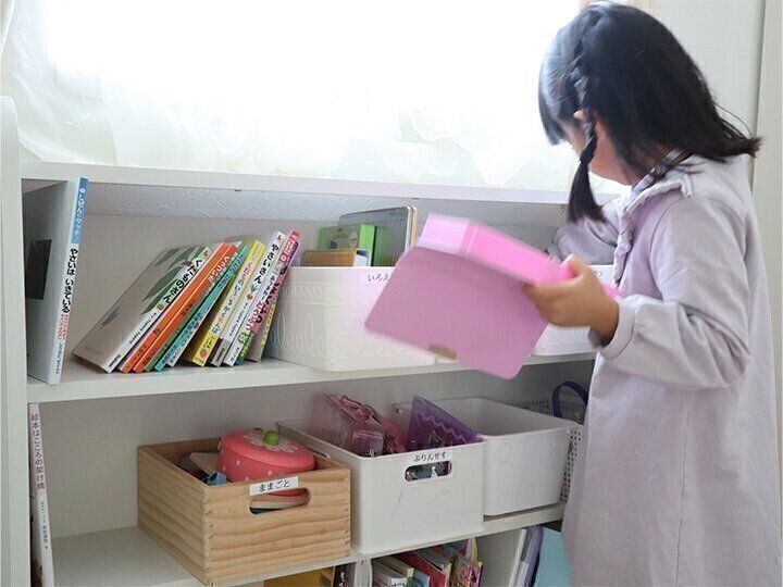 子どもが自分で片づけしやすい場所と高さに棚を設置。子ども自身が物をスムーズに出し入れすることで、片づく家が実現しました。