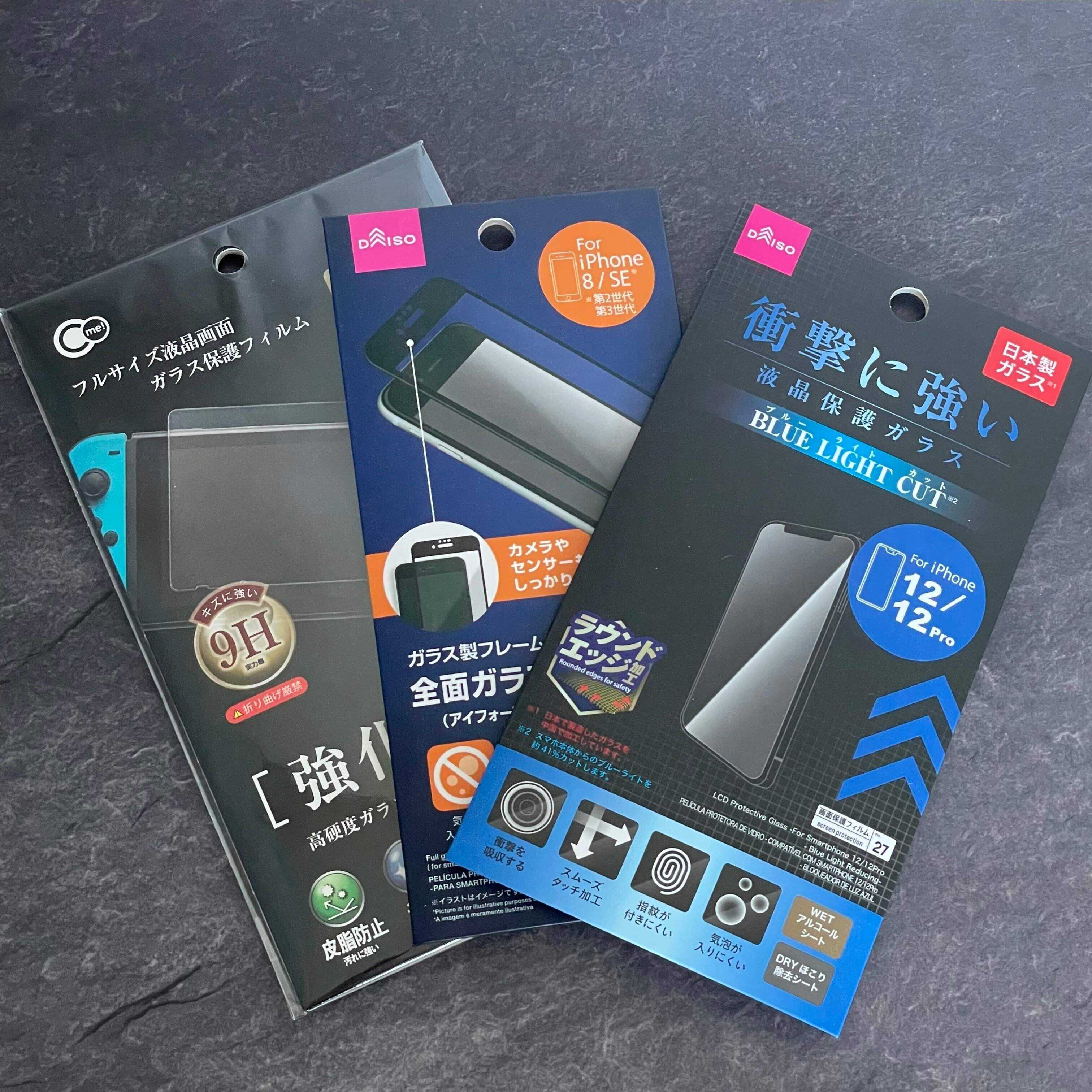 そんなときは、100均の強化ガラスフィルムがオススメです。どれを選んでも1枚110円。