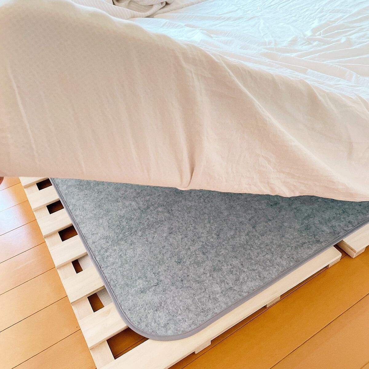 マットレスの下に敷いてもよいですし、マットレスとベッドパットの間でもよいそうです。