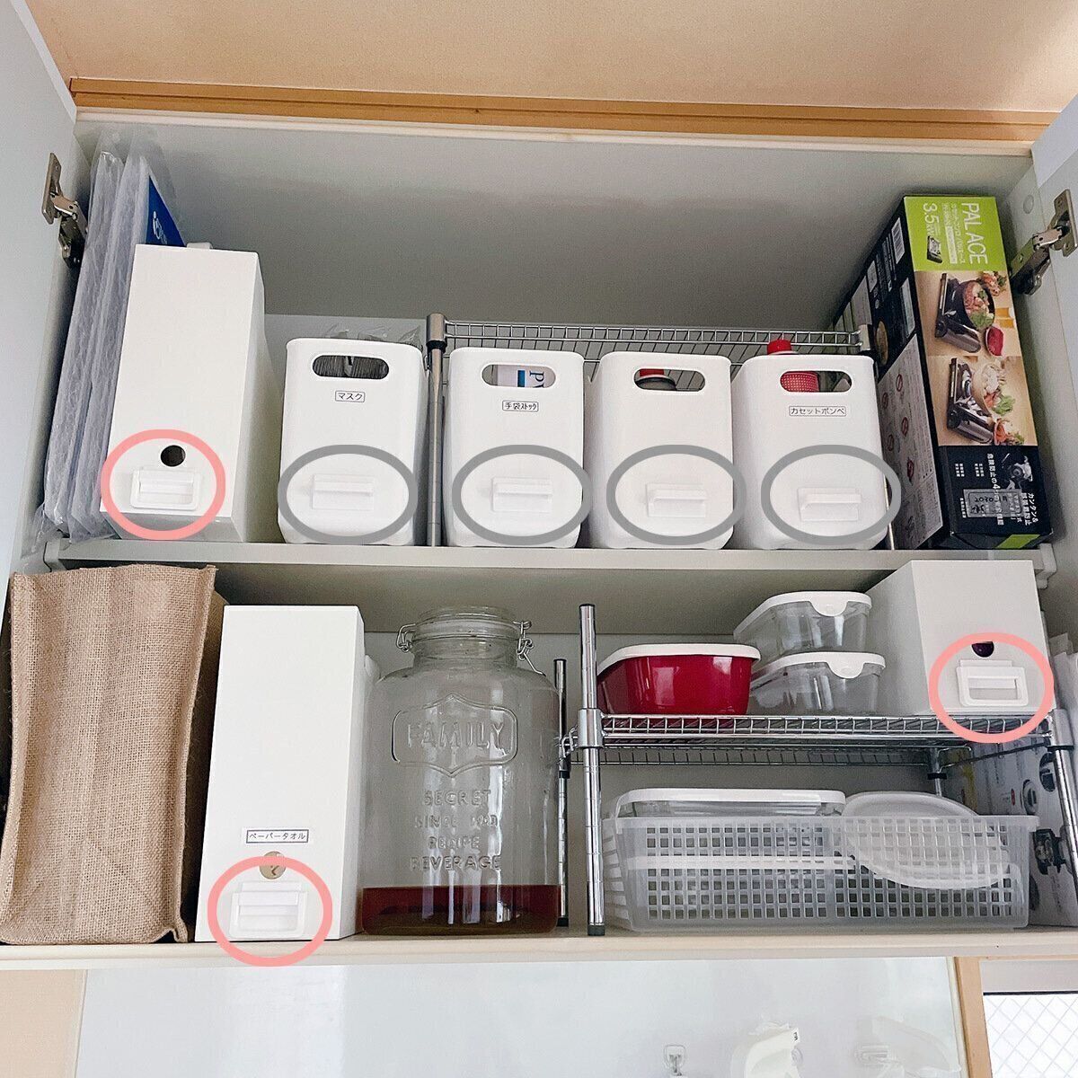 吊戸棚のファイルボックスに可動式、セリアで購入したボックスは棚に対して奥行きの余裕があるのでツマミタイプを貼っています。
