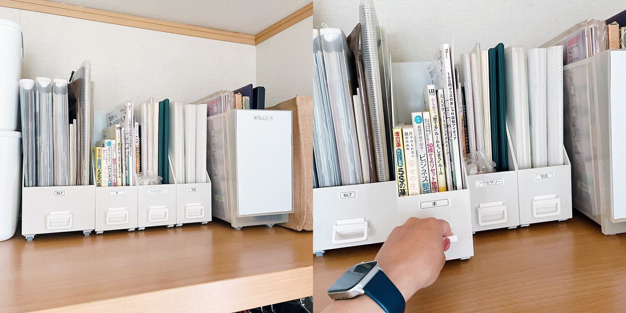 本などの重いものを入れているファイルボックスですが、取っ手とキャスターのおかげでスムーズに引っ張り出せます。